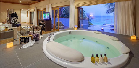 Direct beach access, pristine lagoon views, private courtyard with bath, waterfall shower and plunge pool.