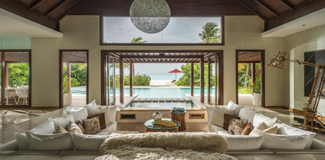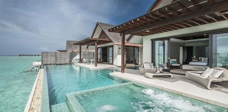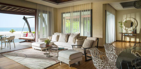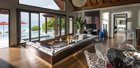 Inside, red accents explode amidst airy white interiors. High-tech toys and gourmet treats create an indoor playground, and the rain showers, your private waterfalls. For more, ring your personal Thakuru – your whim is our command.